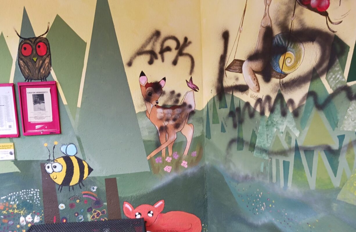 Irgendjemand hat nun das Tierbild mit schwarzer Farbe beschmiert und bekrakelt. Wegen Sachbeschädigung ist Anzeige erstattet worden.