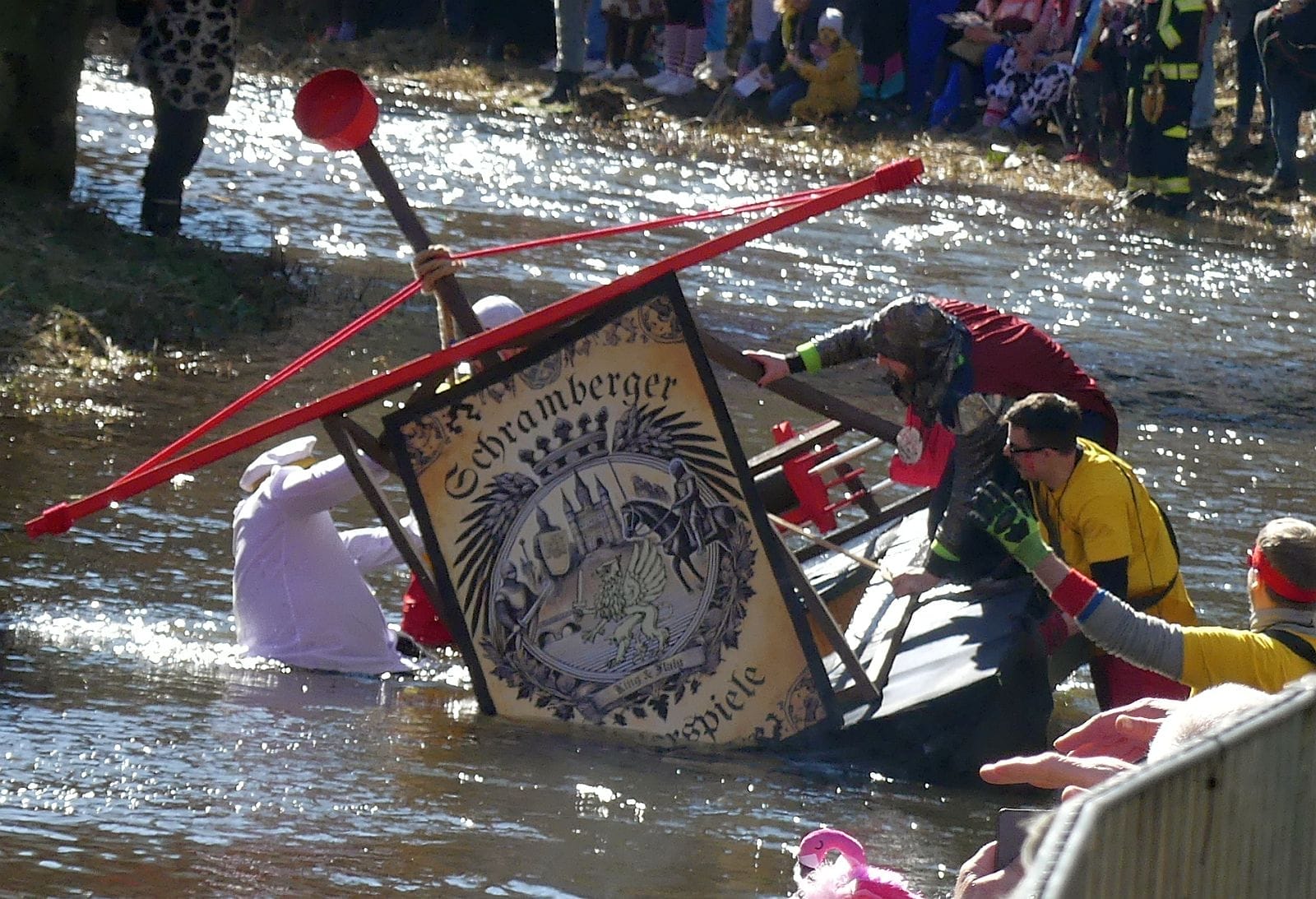 Schramberg. Zwei Premieren gab es heuer: OBin Dorothee Eisenlohr machte ihre erste Kanalfahrt und aus der Schweiz war Lachens Gemeindepräsident Emil Wodli für einen erkrankten Bach-na-Fahrer eingesprungen und fuhr im Zuber 14 mit. Am Rossgumpen hieß es für ihn „batsch – nass“. Renate und Sigger Hafner hatten eine Wildcard, die sie aber nicht nutzen konnten.
