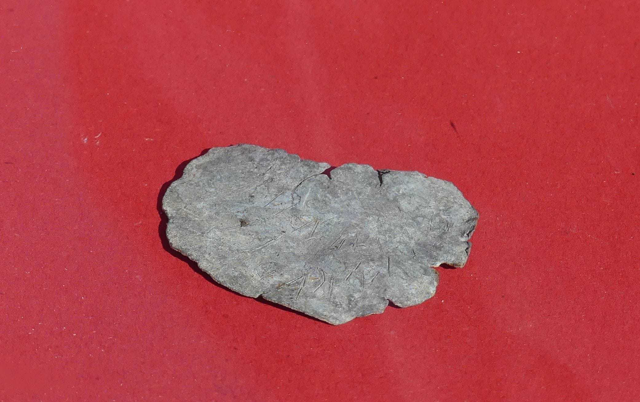 Kortüm und seine Mitarbeiterinnen und Mitarbeiter hatten etliche römische Fundstücke mitgebracht. Scherben von Tonkrügen, aber auch ein besonders schönes Stück von einem Glaskrug oder ein Stück von der römischen Mauerkrone. Ein noch ganz neues Fundstück war ein kleines Täfelchen aus Blei, in das Buchstaben geritzt waren. Es sollte magische Kräfte entwickeln.