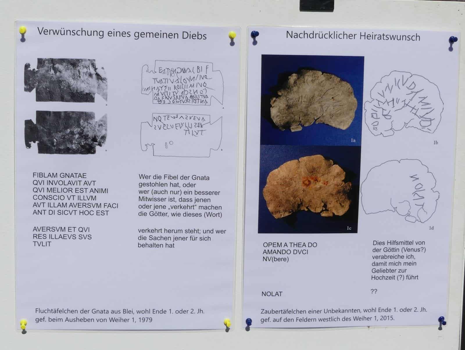 In diesem Fall war es eine Bitte an die Göttin der Liebe, Venus, sie möge der Spenderin des Täfelchens helfen, einen noch nicht ehewilligen Mann zu überzeugen, dass er sie heiraten solle. Auf einem anderen Täfelchen wird der Dieb einer Brosche verwunschen. Die Götter der Unterwelt sollten ihn bestrafen. „Das waren also die Probleme der alten Waldmössinger“, scherzte Kortüm. Solche Täfelchen seien sehr selten, die beiden aus Waldmössingen die einzigen, die bislang in Baden-Württemberg gefunden worden seien.