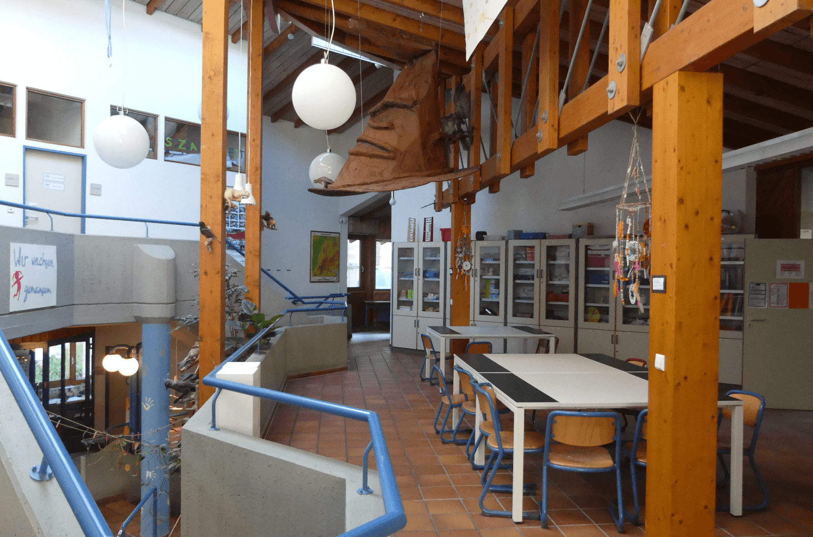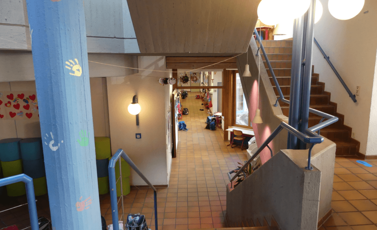 Im Gymnasium auf der anderen Straßenseite unterrichten die Lehrerinnen und Lehrer zwei vierte Klassen. Auch zum Mittagessen müssen die Kinder über die Straße ins Gymnasium. Am Nachmittag wandern einige Gruppen hinüber ins „Eulennest“. Im Cityhochhaus im ehemaligen Adessa-Laden hat die Stadt einen Bewegungsraum eingerichtet.