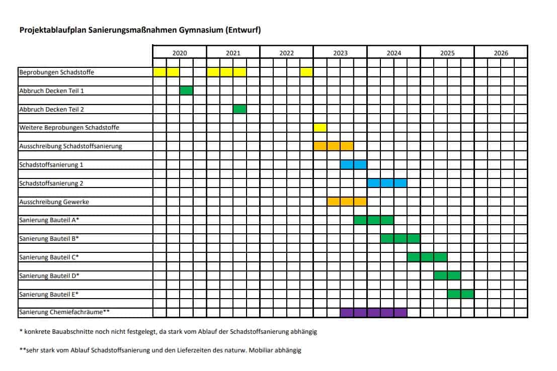 Wenn diese Ergebnisse vorliegen, werde ein Büro das Leistungsverzeichnis für die Schadstoffsanierung erstellen, damit diese während der schulfreien Zeit im Sommer umgesetzt werden können. Parallel will die Stadt auch die Planungen der eigentlichen Sanierungsmaßnahmen fortsetzen, die Leistungsverzeichnisse erstellen und die Terminplanung in Abstimmung mit dem Gymnasium erarbeiten.