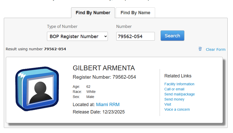Armenta wurde schließlich im Mai 2024 zu fünf Jahren Haft verurteilt, die er in einem Gefängnis für „White Collar-Criminals“ in Florida verbüßt. Da er zum Zeitpunkt des Urteils bereits zwei Jahre in Florida unter Hausarrest gestanden und acht Monate in U-Haft in New York gesessen hatte, war sein Entlassungstermin erst auf den 12. September 2026, dann auf den 5. Mai 2026 bestimmt worden. Inzwischen darf er sogar noch deutlich früher wieder raus, einen Tag vor Heilig Abend nämlich.