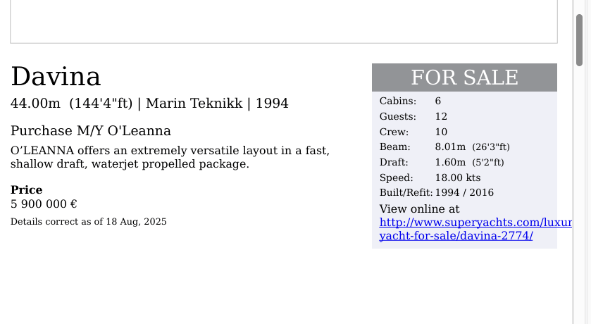 Obwohl nun ein Boot mit Namen O‘Leanna zum Verkauf steht und nicht die Davina, ist ein Experte überzeugt, dass es ein und dasselbe Schiff ist. Streib zitiert Siegfried Dezkeit vom Verband der Sportboot- und Schiffbausachverständigen. Anhand von Fotos der Davina und O’Leanna kommt er zum Schluss, dass dies dasselbe Schiff ist. Auch der Laie erkennt, dass es sich bis auf wenige Veränderungen um dieselbe Yacht handelt.