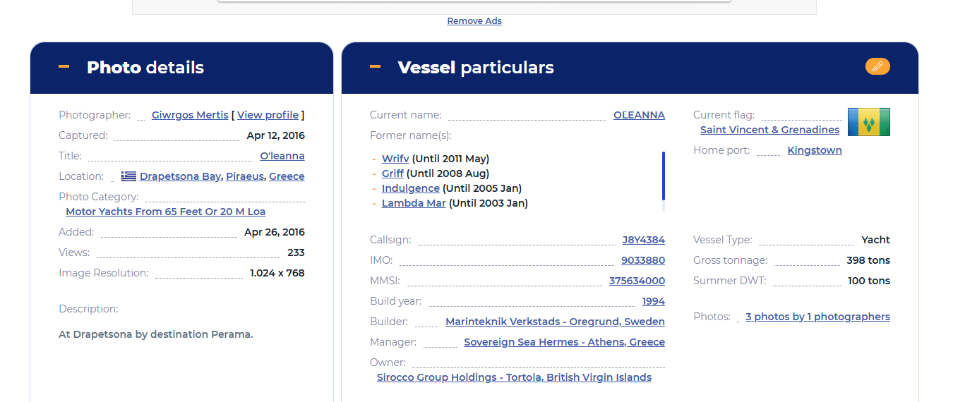 Im April 2016 war sie in einer Bucht bei Piräus gesichtet worden. Damals war eine „Sirocco Group Holdings“ auf den British Virgin Islands Eigentümer der „O’Leanna“.