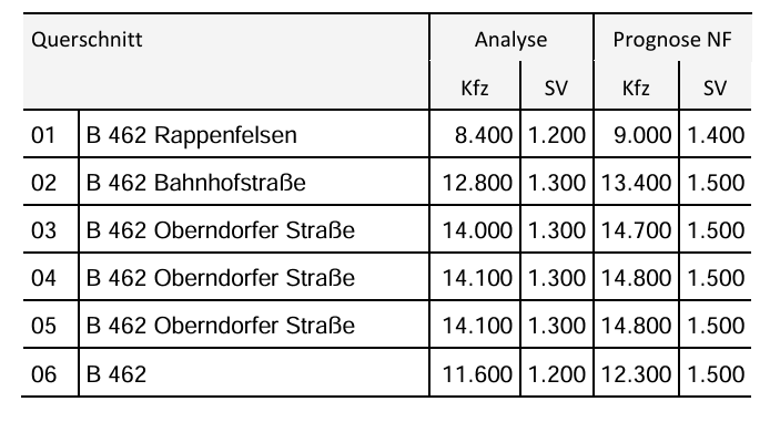In ihrer Prognose bis zum Jahr 2035 gehen die Wissenschaftler von einer zusätzlichen Verkehrsbelastung auf der B 462 von 700 Kraftfahrzeugen pro Tag aus. Zur Begründung heißt es: „Die geringen Zunahmen ergeben sich insbesondere durch eine nahezu unveränderte Einwohnerentwicklung und fehlende signifikante gewerbliche Entwicklungen, gepaart mit einem ausgebauten überörtlichen Streckennetz.“