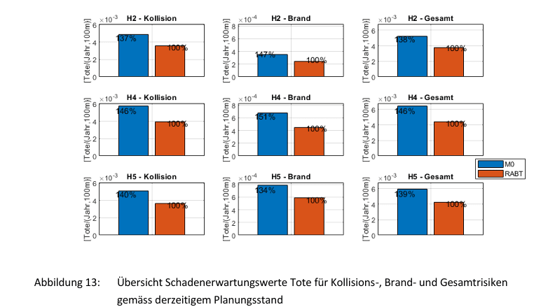 Bei seiner Analyse kommt er zum Schluss, bei den für Schramberg geplanten Tunnelvarianten läge das Risiko für Brände und Kollisionen höher als bei RABT-Projekten. (Richtlinien für die Ausstattung und den Betrieb von Straßentunneln).