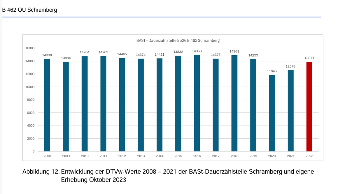 Das Verkehrsgutachten der Karlsruher schafft nun auch offiziell Klarheit: „Bereits die Verkehrsbelastungen in der aktuellen Analyse 2023 sind geringer als die im Jahr 2003 berechneten Werte, die für das Jahr 2020 eine Verkehrsbelastung von 19.800 Fz/24h prognostizierten.“ Also Fahrzeugen am Tag. Dies ergebe sich unter anderem aus damals höher angesetzten Steigerungsraten für die Prognose. „Die BASt-Dauerzählstelle Schramberg zeigt für die Jahre 2008 bis 2019 lediglich eine geringe Schwankung.“