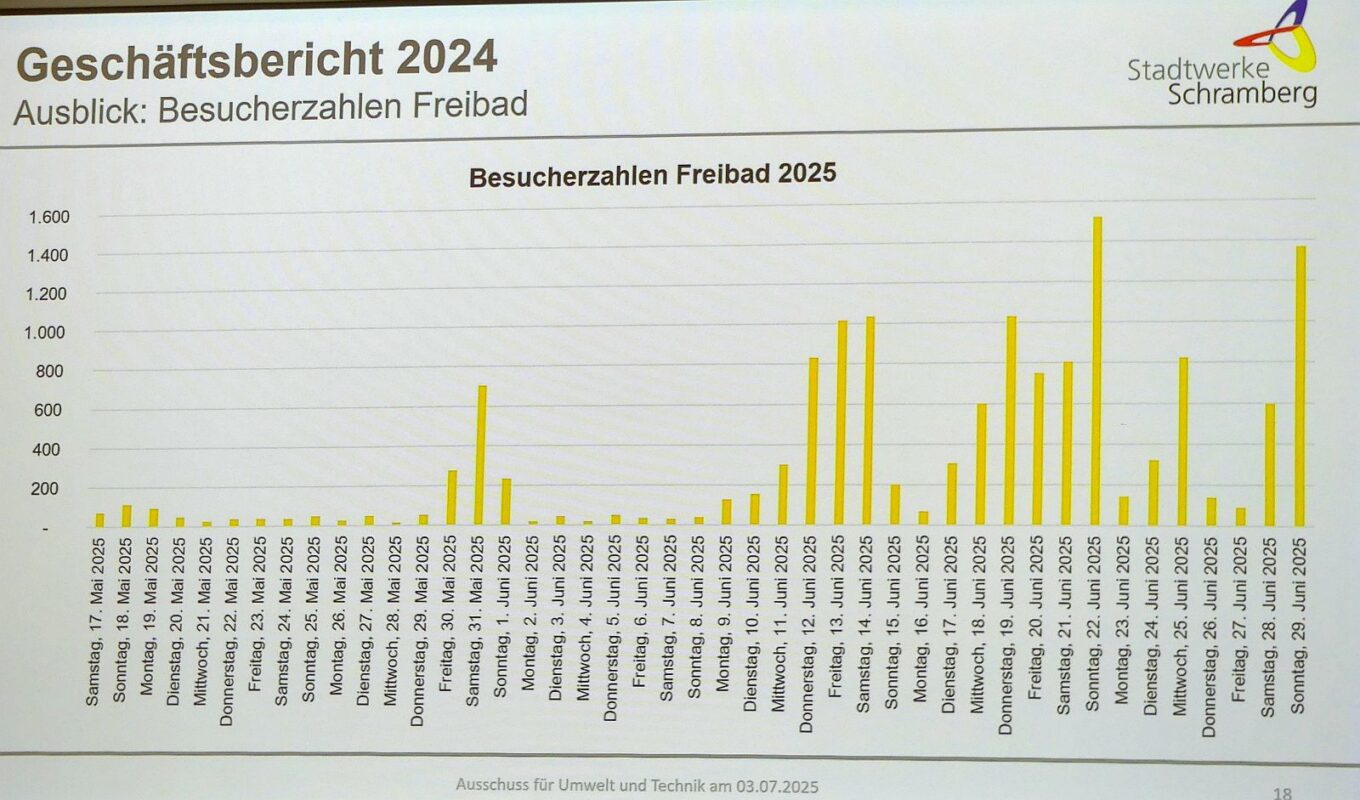 Beim Freibad ist Kälble für dieses Jahr optimistisch, die angestrebten 50.000 Besucherinnen und Besucher zu erreichen. Anfang Juli seien es schon 14.500 gewesen, fast dreimal so viele wie im verregneten Frühsommer 2024. Die Zahlen schwankten extrem je nach Wetterlage.