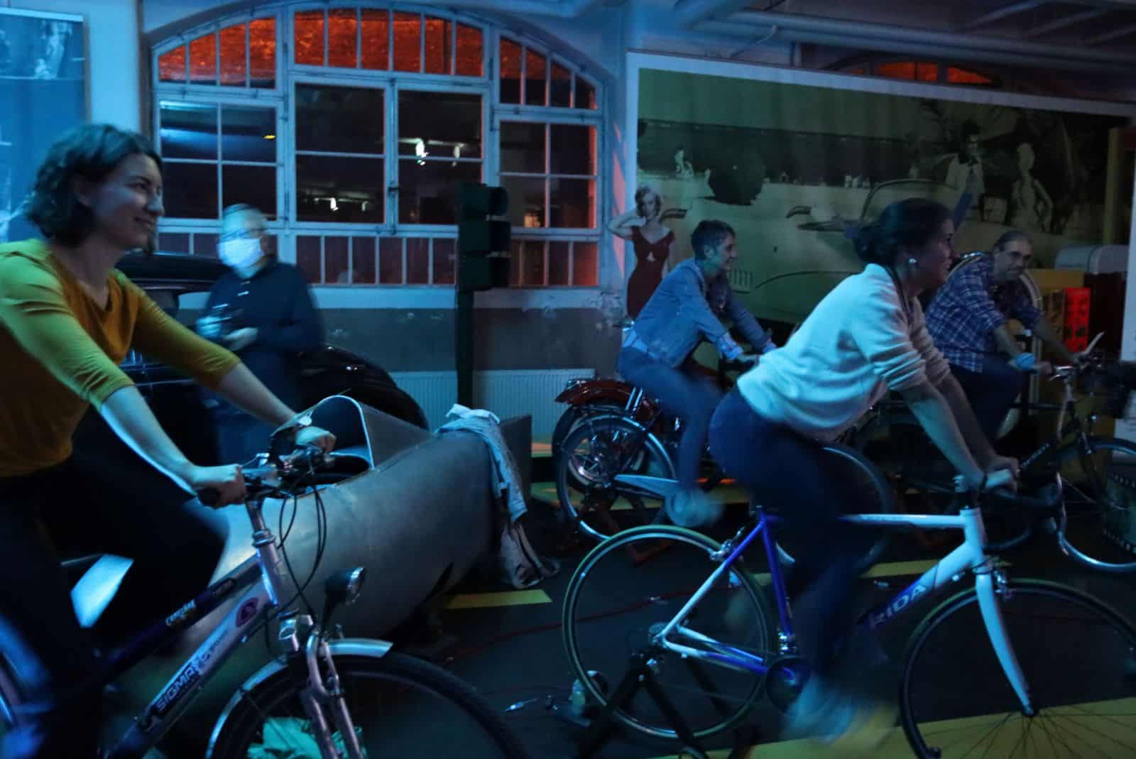 Wer ein Handzeichen gab, konnte sich ablösen lassen – nachdem Museumsmitarbeiterinnen den Lenker desinfiziert hatten. Nach etwa einer viertel Stunde merkte man, dass es durchaus anstrengend ist, beständig 50 Watt Strom zu liefern.
