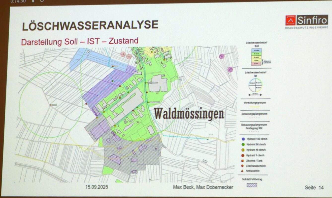 Max Dobernecker von Sinfiro erläuterte die Vorgehensweise: Flächennutzungspläne und Bebauungspläne nach Wohngebieten und Bebauungsarten durchschauen, prüfen, wie viel Löschwasser man jeweils braucht und feststellen, was ist vorhanden. Daraus sind Karten entstanden, die zeigen, wo die Bedingungen erfüllt sind – und wo eben nicht. Bei den Hydranten sei oft nicht bekannt, wie viel Wasser in welcher Zeit dort zu entnehmen ist.
