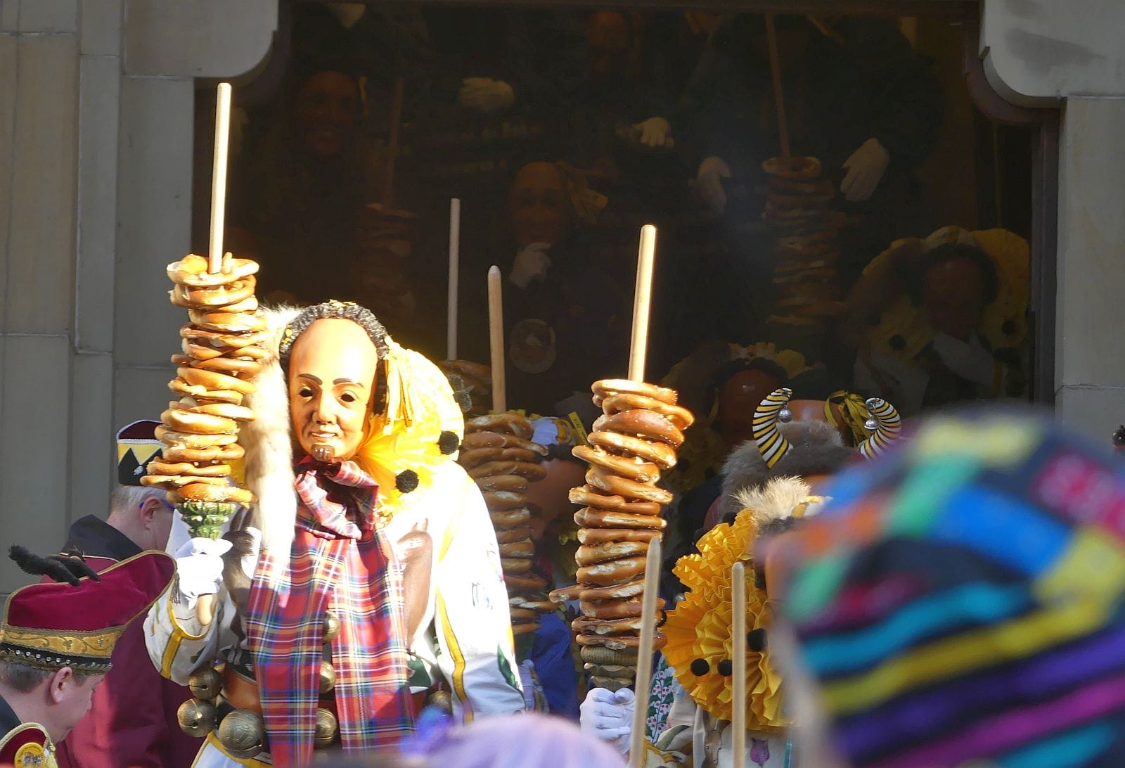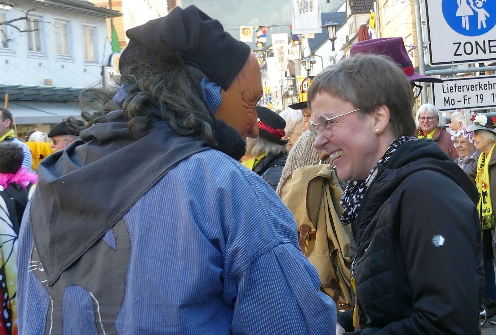 Dort warteten schon viele Leute, auf die Hansel, Narro, Bruele und Bach-na-Fahrer, um ein letztes Mal für dieses Jahr zu jucken. Die Stadtmusik verkürzte die Zeit. Und pünktlich um 16 Uhr öffnete sich die Rathaustür….“Hoorig, hoorig, isch dia Katz…“