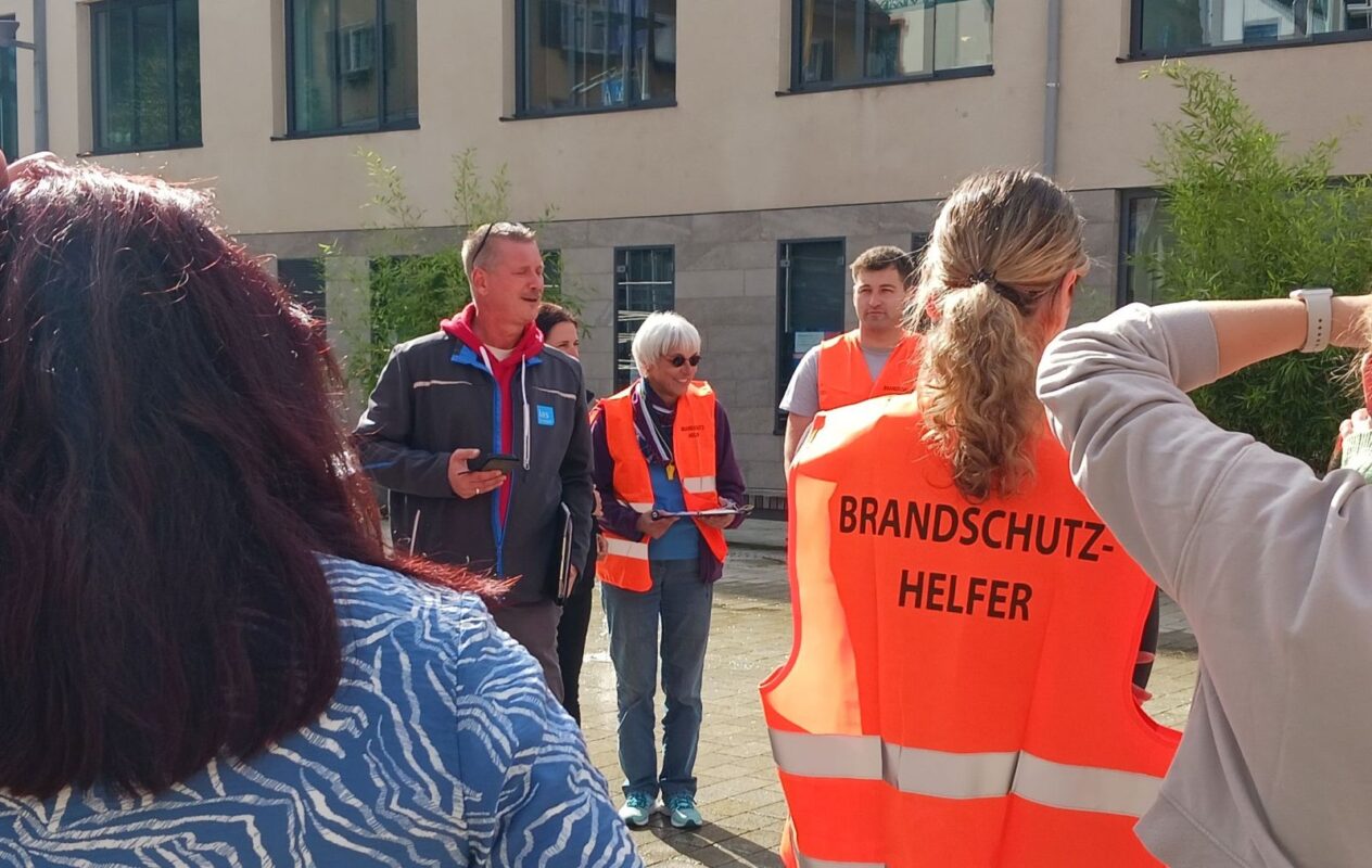 Kirschner hat inzwischen die „Evakuierten“ um sich geschart. Der Brandschutzfachmann geht nochmal die wichtigsten Punkte durch. Im Alarmfall alles stehen und liegen lassen, das Gebäude verlassen und zum Sammelpunkt gehen.