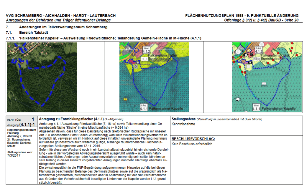 Öffentlich darüber beraten hat der Ausschuss für Umwelt und Technik des Gemeinderats im Zusammenhang mit der 9. Punktuellen Änderung des Flächennutzungsplans im Mai 2021. Darin ist nämlich ein Gebiet für einen „Friedwald“ bei der Falkensteiner Kapelle ausgewiesen. „Die Kapelle möchte ein privater Investor als Begegnungsstätte in das Friedhofskonzept einbeziehen“, berichtete die NRWZ damals.