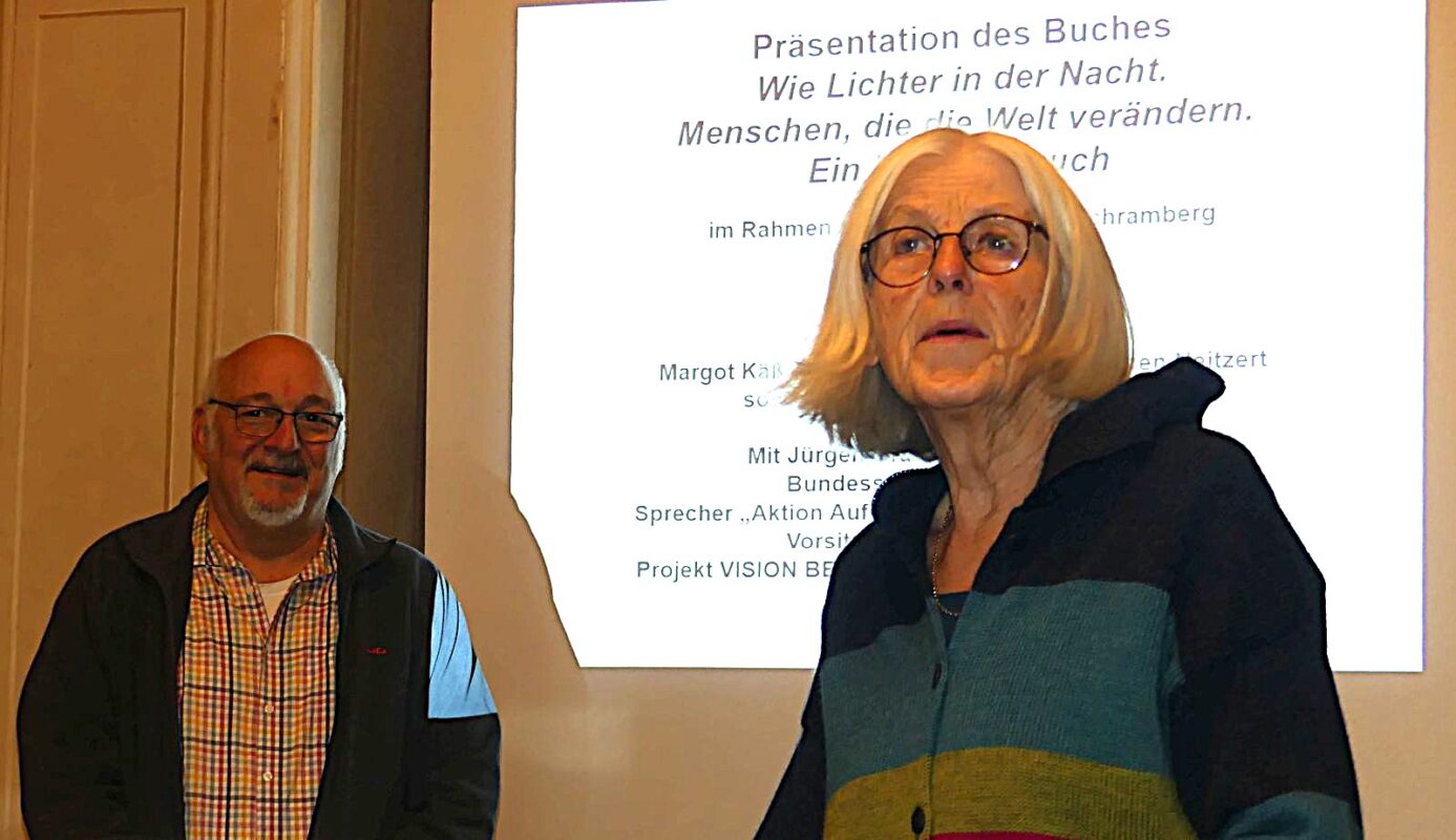 Grässlin erzählt aus seiner Zeit als Wehrpflichtiger. Da habe ihn ein Tagesbefehl „Wir schießen heute auf Chinesen“ zum Pazifisten werden lassen. Er habe keinen einzigen scharfen Schuss abgegeben, erinnert er sich. Grässlin, der seit 40 Jahren mit vier Stunden Schlaf auskommt, wie er den etwa 40 Besucherinnen und Besuchern mitteilt, hat in 19 Kapiteln Menschen vorgestellt, die Mut machen.