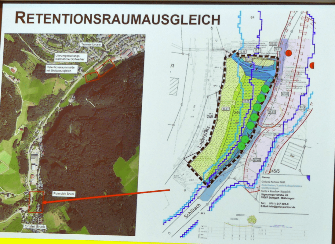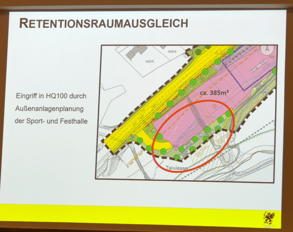 Ausführlich ging Joos auf das Hochwasserproblem ein. Ein Stück des geplanten Parkplatzes, nicht aber die Halle selbst befinde sich im HQ 100 Gebiet. Das heißt, ein statistisch alle hundert Jahre zu erwartendes Hochwasser könnte dieses Gebiet überfluten. Mit zwei Ausgleichsflächen ober- und unterhalb der Halle soll die Gefahr weiter reduziert werden.“ Das Wasser wird zurückgehalten“, so Joos.