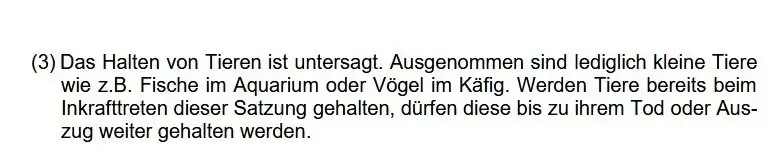 In der Vorlage für den Gemeinderat, die der für den Verwaltungsausschuss entspricht, geht Fachbereichsleiter Matthias Rehfuß nicht auf die im Verwaltungsausschuss geäußerten Änderungswünsche ein. Ebenfalls unverändert geblieben ist der Paragraf 7 Absatz 3 wonach das Halten von Tieren untersagt ist.