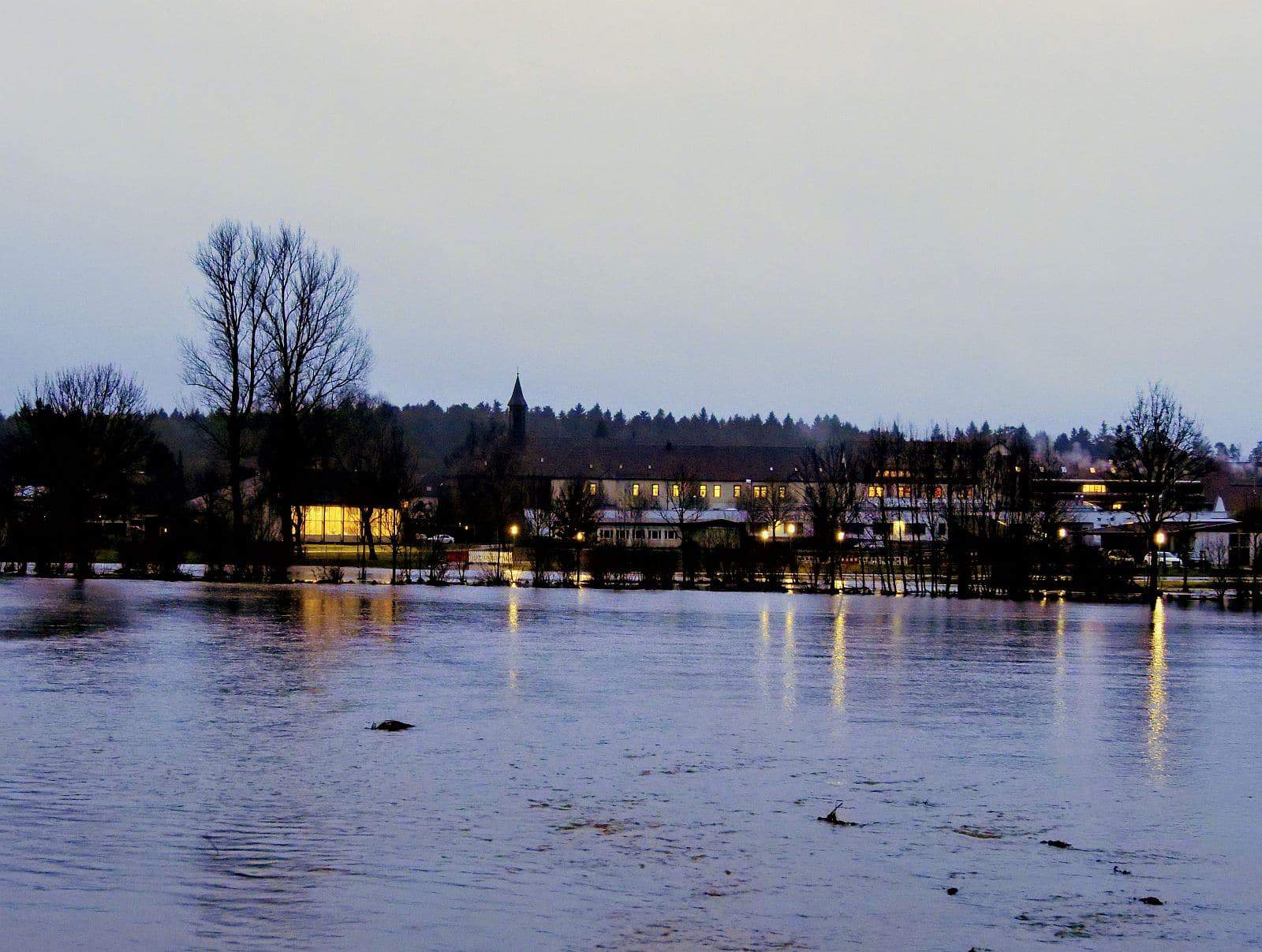 Um das Kloster und die Stiftung St. Franziskus fließt die Eschach, zu normalen Zeiten ein kleines Bächle. Durch den Dauerregen der vergangenen Tage ist die Eschach mächtig angeschwollen und, durch einige Biberdämme zusätzlich aufgestaut, hat sie nun die Wiesen ringsum überflutet.