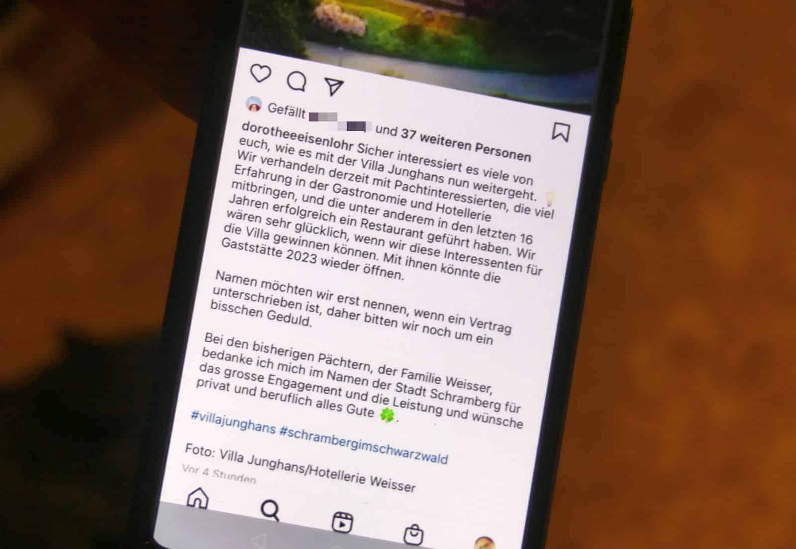 Offen bleibt in Eisenlohrs Post auch, welches Konzept die neuen Pächter für die Villa Junghans umsetzen wollen. Die bisherigen Pächter hatten immer wieder größere Sanierungen in und an der Villa angemahnt und schließlich den Pachtvertrag fristgerecht gekündigt.
