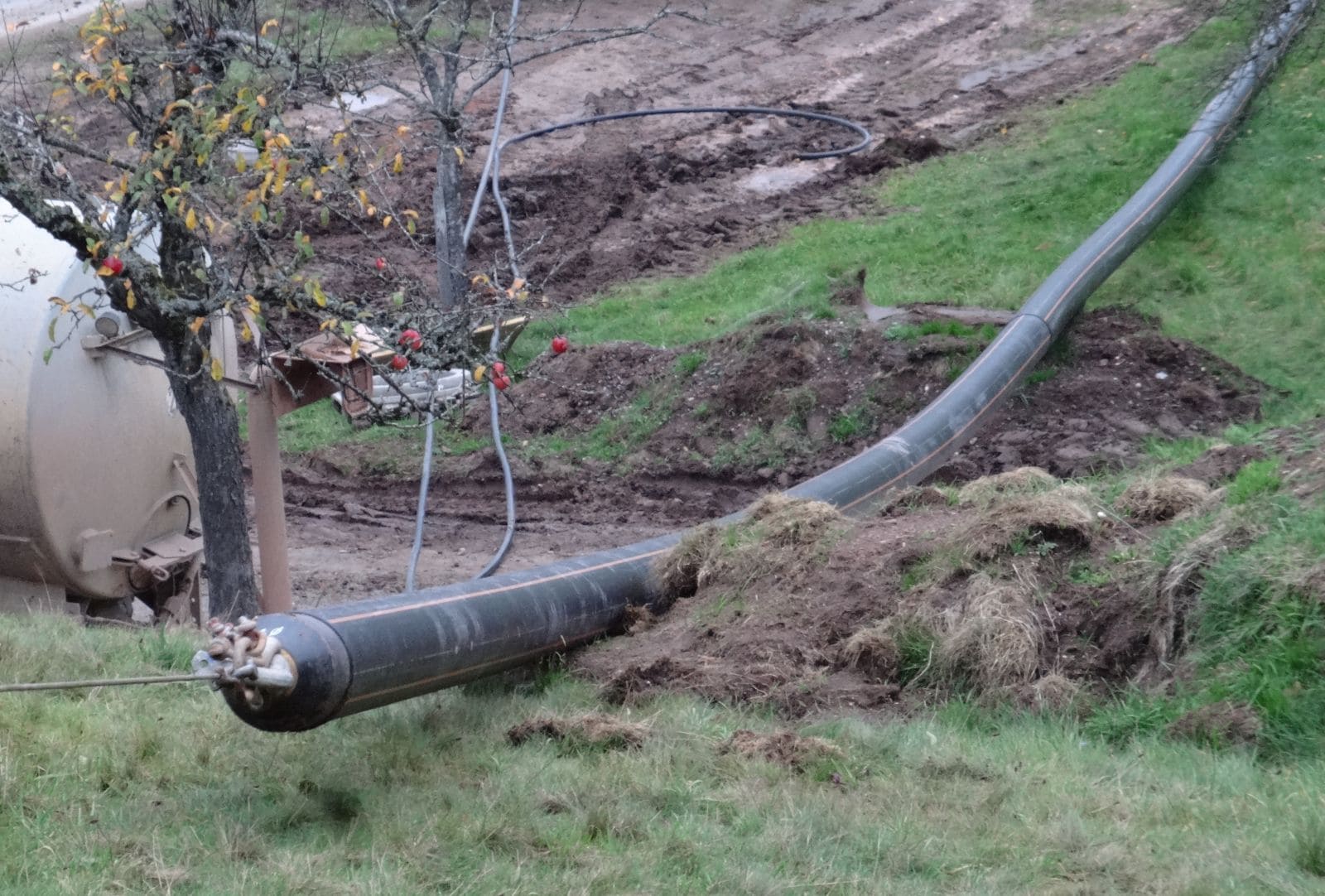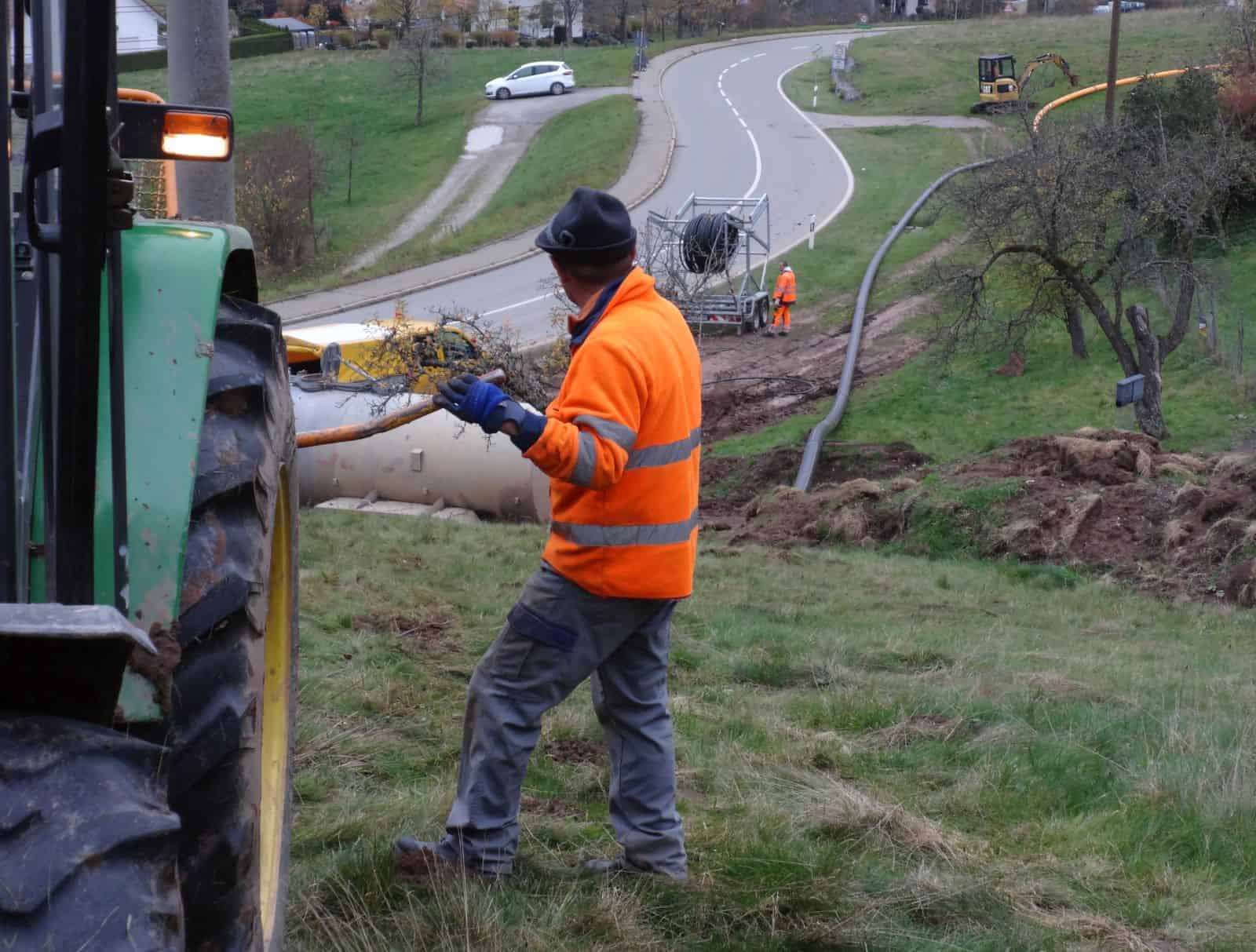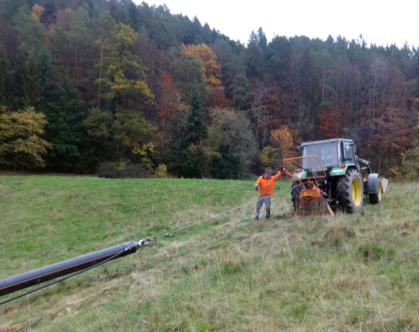 Neben dem eigentlichen Abwasserrohr haben am Morgen die Bauarbeiter ein zweites, dünneres Rohr ins das Loch eingezogen. Auf der Wiese hatten sie zuvor das gut 300 Meter lange Plastikrohr ausgelegt. Mit Unterstützung von Meinrad Kopp vom Kristleshof, der mit Traktor und Seilwinde vor Ort war, ziehen sie das Rohr bis zum Ausgang des Bohrloches.