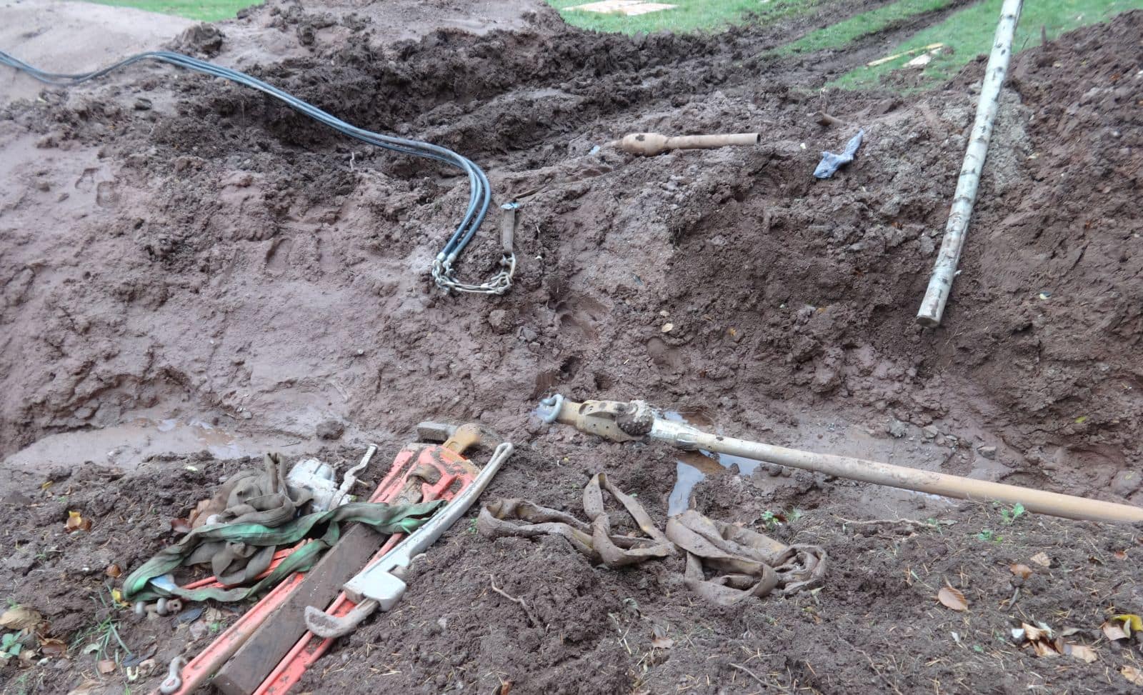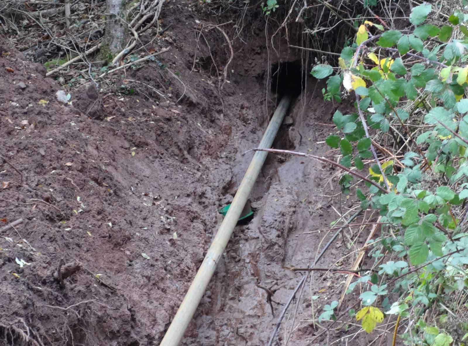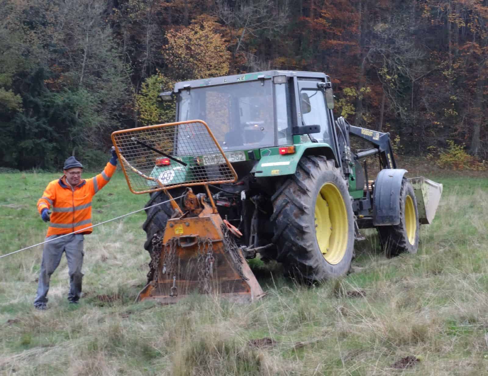 Neben dem eigentlichen Abwasserrohr haben am Morgen die Bauarbeiter ein zweites, dünneres Rohr ins das Loch eingezogen. Auf der Wiese hatten sie zuvor das gut 300 Meter lange Plastikrohr ausgelegt. Mit Unterstützung von Meinrad Kopp vom Kristleshof, der mit Traktor und Seilwinde vor Ort war, ziehen sie das Rohr bis zum Ausgang des Bohrloches.