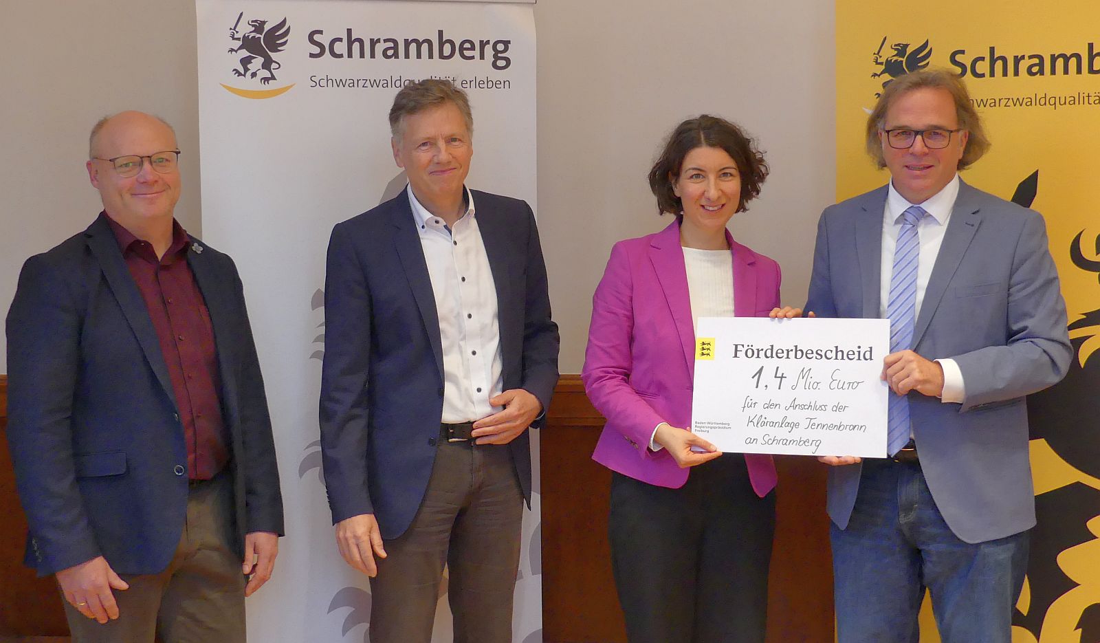 Regierungspräsident Carsten Gabbert hat Schrambergs Oberbürgermeisterin Dorothee Eisenlohr heute zwei Zuwendungsbescheide übergeben. Insgesamt 1,4 Millionen Euro erhält die Stadt für die ersten beiden von insgesamt vier Bauabschnitten, um die Kläranlage in Tennenbronn still zu legen und den Kanal durchs Bernecktal für den Anschluss an die Gemeinschaftskläranlage in Schramberg zu bauen.