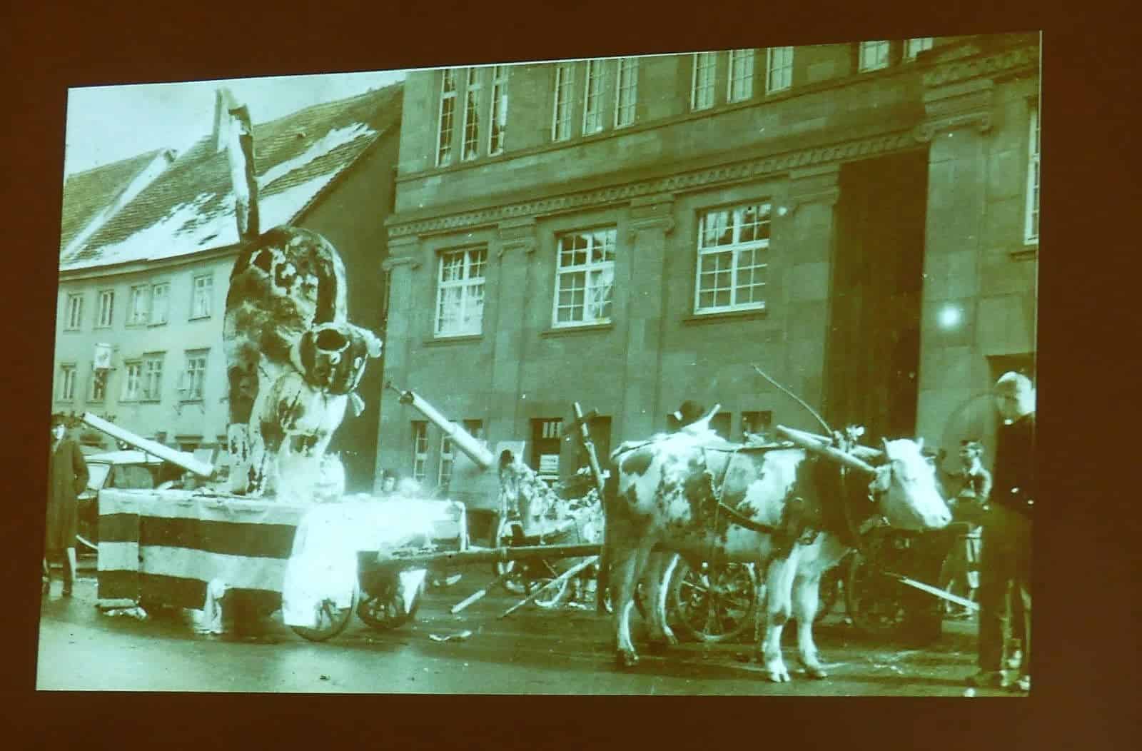 Bei der Arbeit für die Ausstellung sei auch der legendäre Katzenwagen aus den 30er bis 60er Jahren in den Blick geraten. Und beim Abstauben dieses Jahr hätten ihn die Obernarren in das Lager der Zunft am Schwabenhof mitgenommen, wo der Katzenwagen noch heute steht, erzählte Kohlmann.