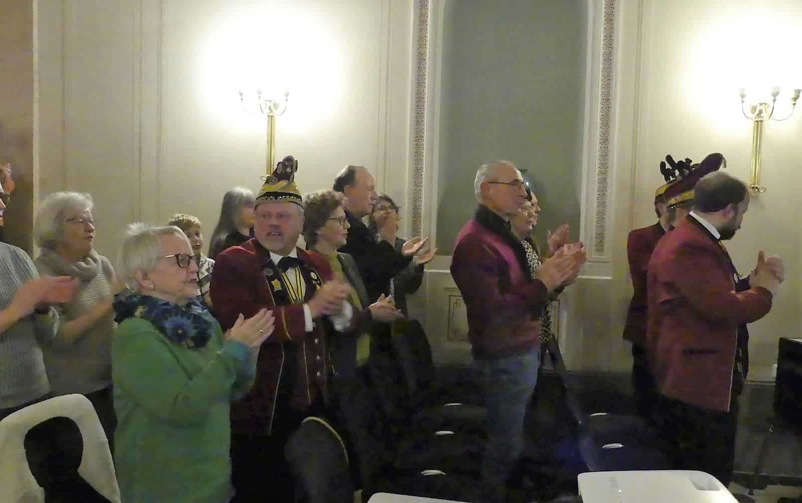 Um die Gäste standesgemäß zu begrüßen, hatte Kohlmann eine sehr frühe Version des Schramberger Narrenmarschs abgespielt. Schon nach wenigen Tönen erhob sich die Gästeschar und stimmte ein. QWenig überraschend, waren doch etliche Elferräte, Obernarren und sonst der Schramberger Fasnet eng verbundene Besucherinnen und Besucher gekommen.