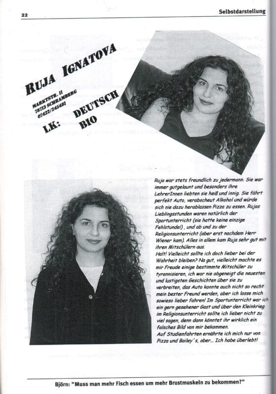 Reisch und Festerling nennen Eigenschaften, die Betrügerinnen und Betrüger häufig kennzeichneten: Intelligenz, Kreativität, starkes Selbstbewusstsein, manipulative Fähigkeiten, die Fähigkeit zu Lügen und Stressresistenz. Schaut man Rujas Abiturs-Jahrbucheintrag aus dem Jahr 1999 unter diesem Blickwinkel an, sind all diese Eigenschaften zu finden.
