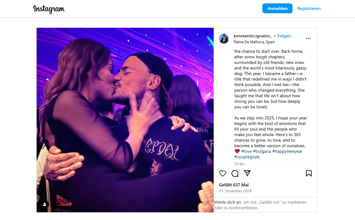Ruja Ignatovas Bruder Konstantin Ignatov geht es, wenn man seinem Instagram-Account und einem Podcast Glauben schenken mag, bestens. Auf Instagram postet er regelmäßig Fotos. Zahlreiche Fans liken seine Beiträge, etwa ein Bild von Silvester 2024: Er zeigt sich in Palma de Mallorca mit seiner Freundin knutschend.