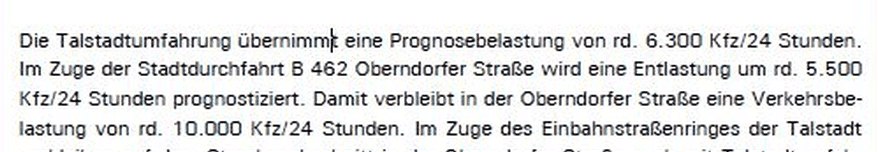 In einer Verkehrsuntersuchung für den Luftreinhalteplan von 2016 gingen die Planer davon aus, dass die Talumfahrung die Oberndorfer Straße um „rund 5.500 Kfz/ 24 Stunden“ entlasten werde, es blieben also „in der Oberndorfer Straße auch mit Talstadtumfahrung rund 10.000 Kfz/24 Stunden“.