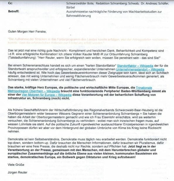 Reuter antwortet Fenske begeistert: „Das ist jetzt mal eine richtig gute Nachricht. Kompliment und herzlichen Dank. Beharrlichkeit und Kompetenz sind i.d.R. eine erfolgreiche Kombination.“ Weiter schreibt Reuter über die Bedeutung harter Standortfaktoren, das “starke kräftige Herz Europas“ und kritisiert dann Schrambergs Oberbürgermeisterin Dorothee Eisenlohr. Sie sei „wider besseren Wissens Gegnerin einer Schienenanbindung Schrambergs“.