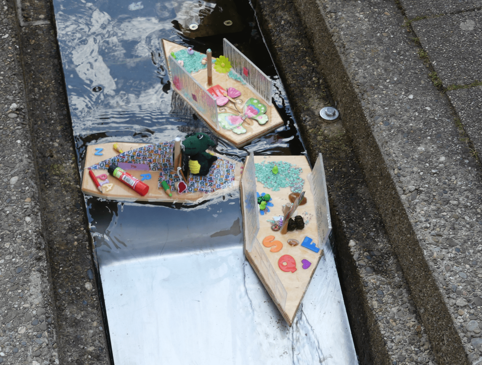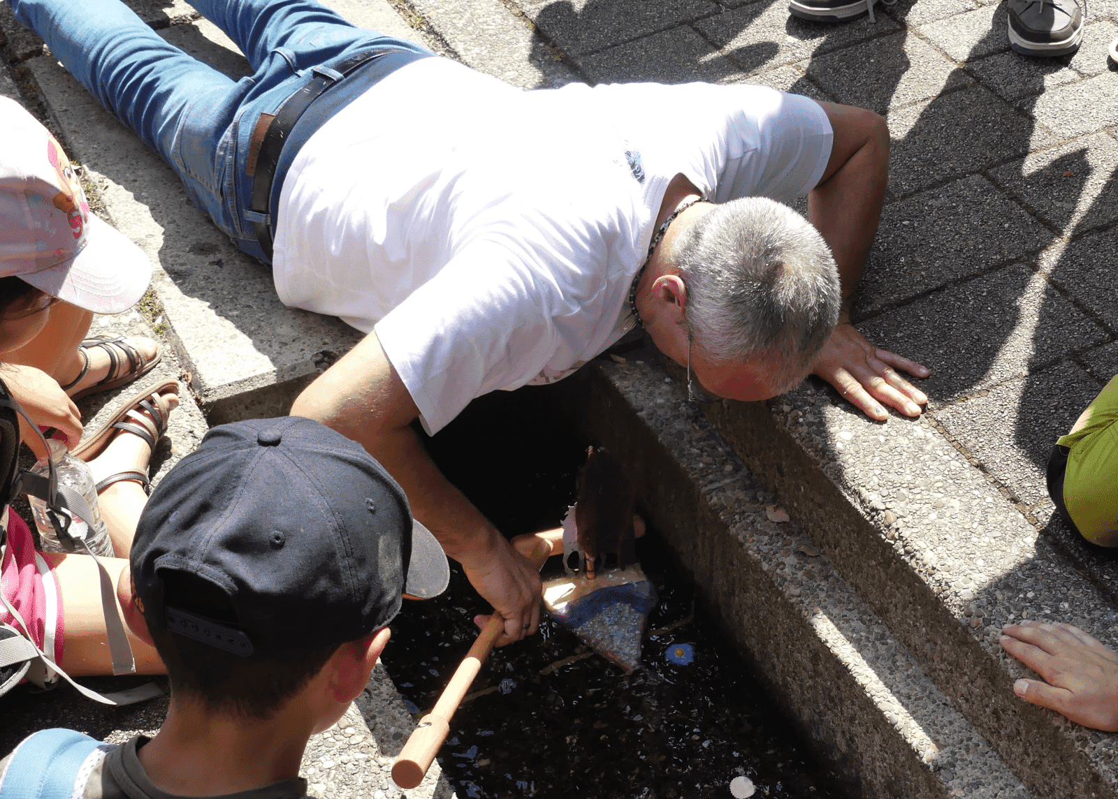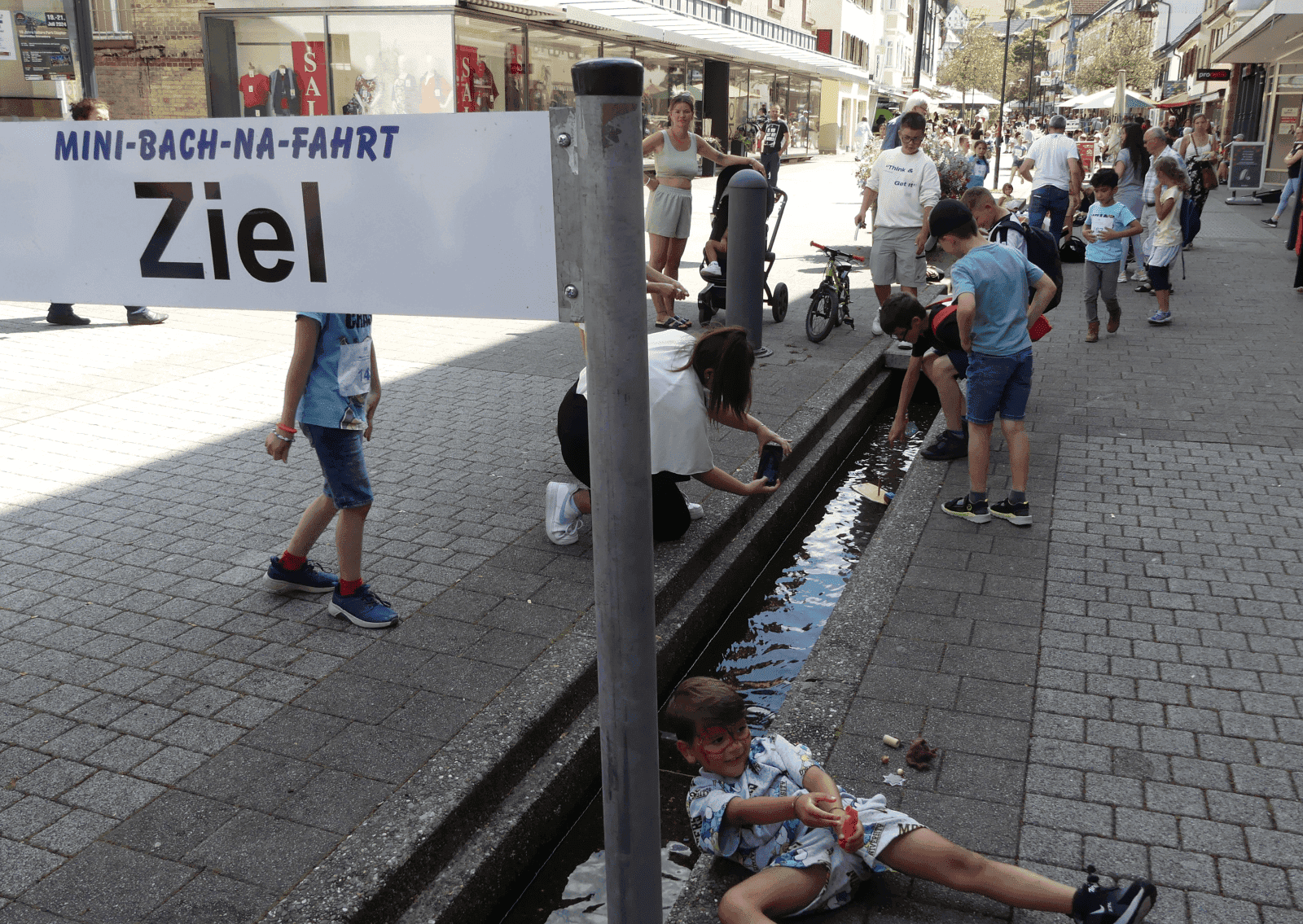 Immer mal wieder stockten die Mini-Zuber, weil die „Schikanen“ im Hess-Bächle schwer zu überwinden waren. Manchmal klemmten Zuber auch unter den „Brücken“ fest. Jürgen Jäger stupfte mit einem Besenstiel die Zuber wieder frei. Einigermaße zerzaust kamen die dann wieder zum Vorschein. Wie halt auch bei der richtigen Da-Bach-na-Fahrt.
