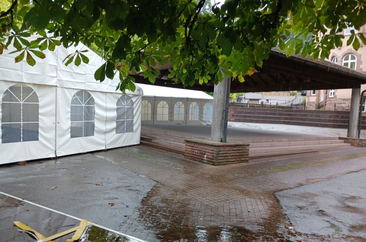 Minischramberg startet: Überall in der Stadt laufen die Vorbereitungen. Auf dem vorderen Rathausplatz steht das Elterncafé, auf den Realschulhof sind die Zelte fürs gemeinsame Abendessen aufgestellt.