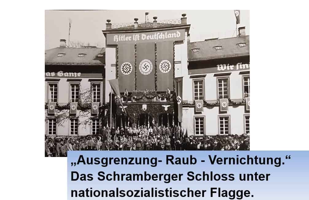 In Schramberg gab es eine Ergänzung, die die Enteignung der Familie Meyer (Majolika) durch die Nazis dokumentierte. Hehr zeigte in ihrer Präsentation das Schloss geschmückt mit Hakenkreuzfahnen. „Ich habe Ihnen dieses eindrückliche Bild vom Schloss unter nationalsozialistischer Flagge mitgebracht, das zur entsprechenden Ausstellung passt, aber auch auf einen interessanten Zufall hinweist.“ Nämlich das am Tag der Ausschusssitzung vor genau hundert Jahren die Stadt das Schloss gekauft hatte (wir haben berichtet).