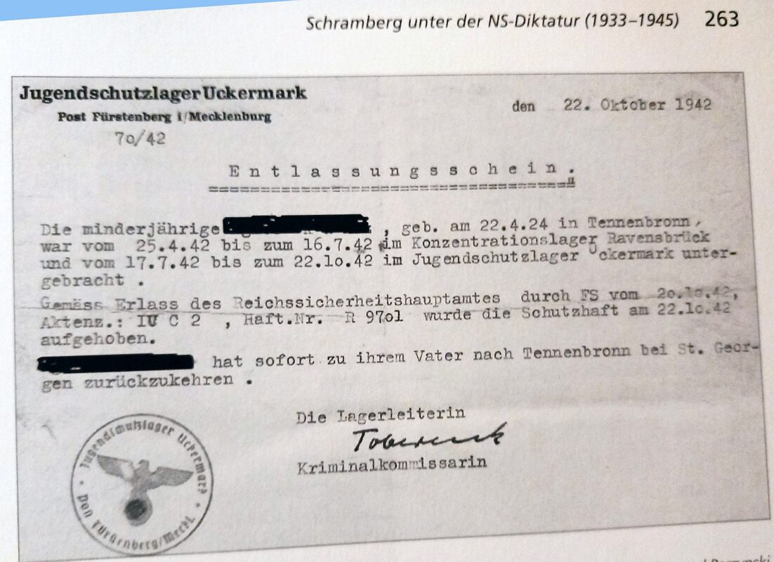 Agnes kam von Villingen erst nach Radolfzell in ein Jugendgefängnis, von dort in das Frauen-KZ Ravensbrück und schließlich in das „Jugenderziehungslager“ Uckermark, das eine Kriminalrätin Charlotte Toberentz geleitet hat.