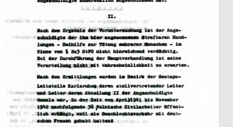 Nach all den Befragungen hat die Staatsanwaltschaft Karlsruhe zwar ein Ermittlungsverfahren eingeleitet. Am 23. März 1962 aber beantragt ein Staatsanwalt Dr. Müller das Verfahren wegen Mordes außer Vollzug zu setzen. Der Beschuldigte habe aus Befehlsnotstand gehandelt.