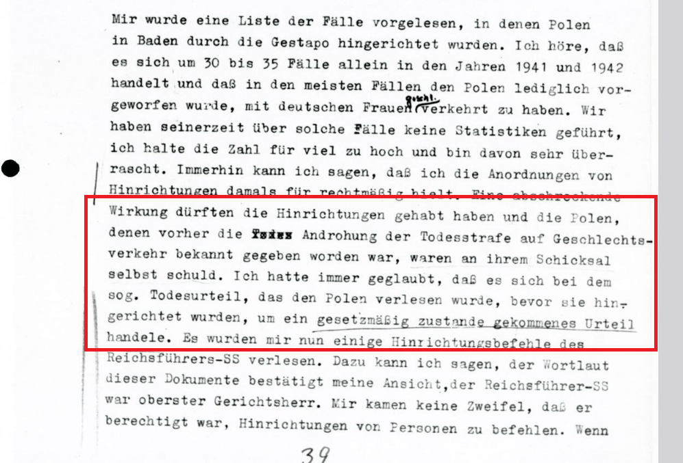 Emil Haas, ein anderer Gestapo-Beamter aus Karlsruhe, hat am 19. April 1961 ausgesagt, es sei trotz der Androhung der Todesstrafe vorgekommen, „dass Polen sich an deutsche Frauen herangemacht und mit diesen Geschlechtsverkehr ausgeübt haben“. In den Dörfern sei so etwas kaum verborgen geblieben. Es hätten „Leute aus der Zivilbevölkerung, der SD, meist aber auch der Ortsgruppenleiter der NSDAP Meldungen über derartige Vorgänge an die Gestapo“ erstattet.