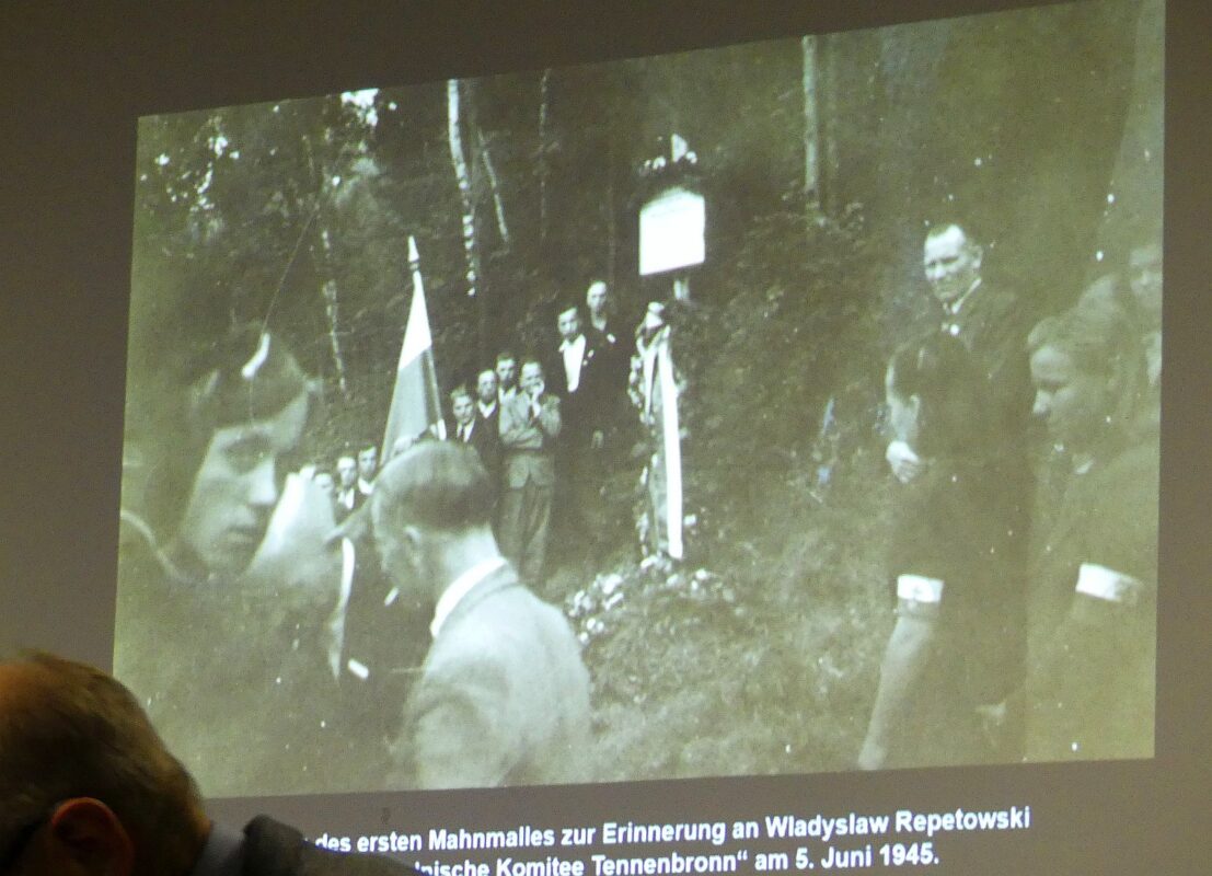 Nur etwa vier Wochen nach dem Ende des Zweiten Weltkriegs haben die ehemaligen polnischen Zwangsarbeiter am 5. Juni 1945 eine Gedenktafel an der Stelle errichtet, an der auf den Tag genau drei Jahre zuvor die Gestapoleute Wladyslaw Repetowski ermordet hatten. Mit dabei Agnes Kunz und ihr kleiner Sohn Franz. Der Ahornbaum stand da nicht mehr. Den habe der Waldbesitzer am Tag nach der Hinrichtung gefällt, erzählt man sich in Tennenbronn.
