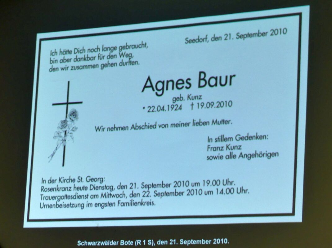 Agnes lebt mit ihrem Sohn und ihrem Vater auf dem elterlichen Hof. 1970 heiratet sie den verwitweten Alfons Baur und zieht zu ihm nach Seedorf. Als Agnes 2010 stirbt, schreibt ihr Sohn Franz in der Todesanzeige: „Ich hätte Dich noch lange gebraucht, bin aber dankbar für den Weg, den wir zusammen gehen durften.“