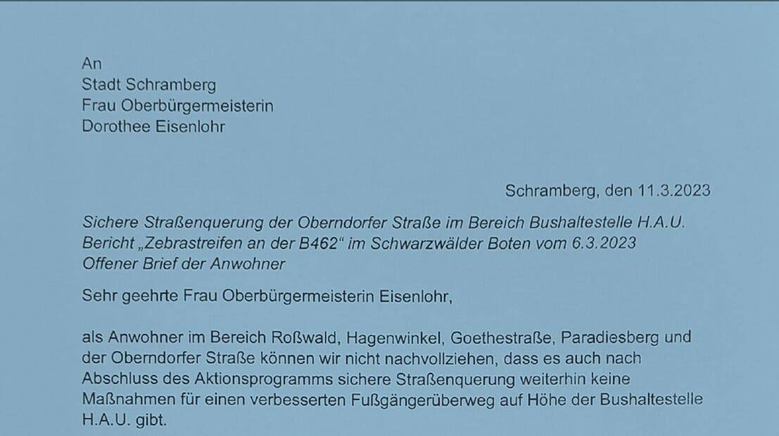 Schramberg. 70 Anwohner aus dem Bereich Oberndorfer Straße, Roßwaldstraße, Im Hagenwinkel, Paradiesberg und Goethestraße wenden sich in einem „Offenen Brief“ an Oberbürgermeisterin Dorothee Eisenlohr und fordern einen Fußgängerüberweg an der H.A.U. an der B 462.