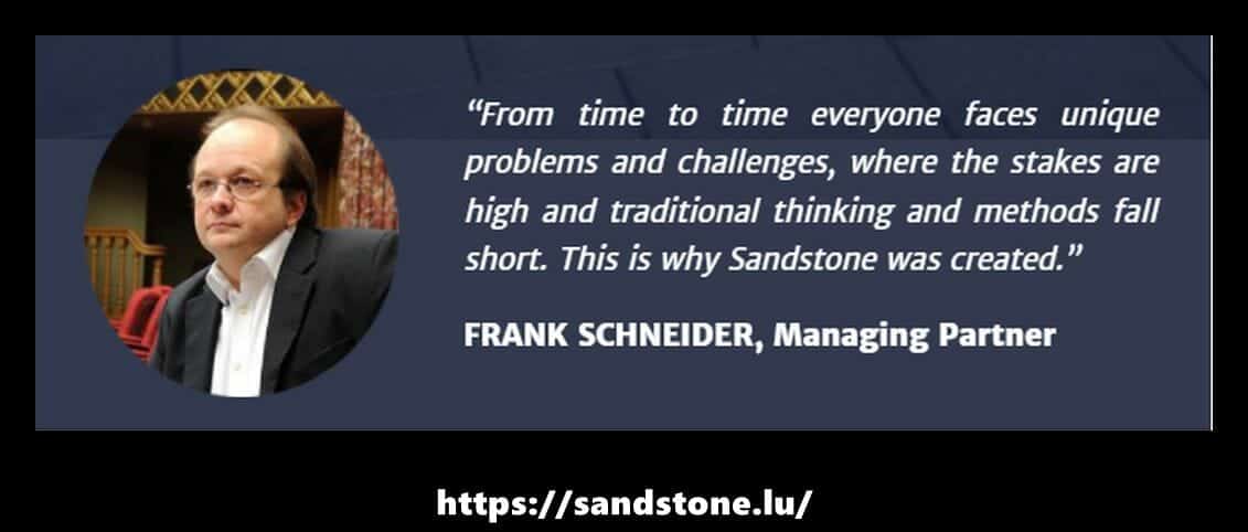 Schneider gründete nach seinem Ausscheiden aus dem Luxemburgischen Geheimdienst,die Beratungsfirma Sandstone. Er hatte in den USA unter anderem für Ruja Ignatova ein Apartment unter der Wohnung von Gilbert Armenta angemietet. Armenta war zeitweise Rujas Lover und einer ihrer Geldwäscher. Ruja misstraute ihm – und Schneider ließ aus dem Apartment ein Loch durch die Decke bohren, um Armenta zu belauschen. Nach Rujas Verschwinden im Oktober 2017 bat Konstantin Ignatov Schneider nach Ruja zu suchen, allerdings vergebens.
