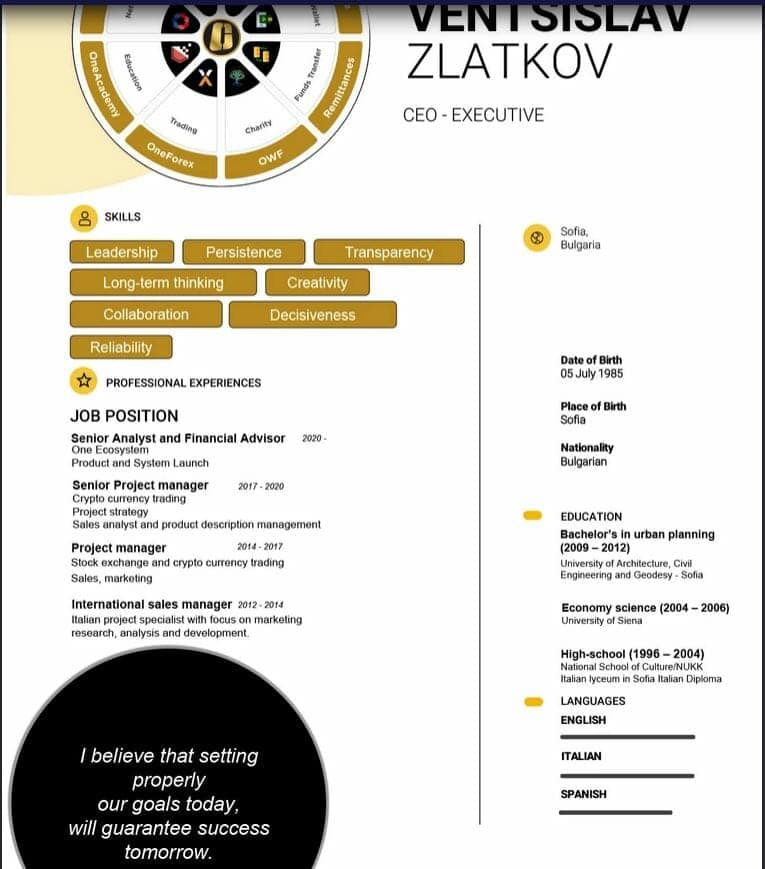 Bei OneCoin arbeitet er seit 2020. Und zwar als „Senior Analyst and Financial Advisor“. Vorher habe er als Verkaufsmanager und Spezialist für Kryptowährungen gearbeitet – bei welchen Firmen erfährt man aus dem Lebenslauf auf einer OneCoin-Seite allerdings nicht.