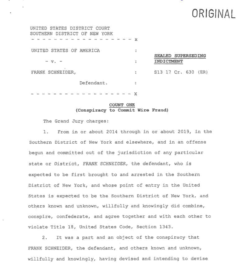 Die Anklage hält nun fest, dass Schneider geholfen habe „bei der Durchführung eines internationalen Betrugsprogramms, das den Verkauf einer angeblichen Kryptowährung namens „OneCoin“ beinhaltete – unter anderem durch die Verwaltung der Erlöse aus dem Programm und die Umgehung von Ermittlungen der Strafverfolgungsbehörden zu dem Programm -, in dessen Rahmen falsche Angaben und falsche Darstellungen gemacht wurden, um Einzelpersonen in der ganzen Welt, einschließlich des südlichen Distrikts von New York, dazu zu bewegen, in OneCoin zu investieren, wodurch Einzelpersonen veranlasst wurden, zwischenstaatliche und internationale Überweisungen zu tätigen, die ihre OneCoin-Investitionen repräsentierten“. (Übersetzt mit www.DeepL.com/Translator)