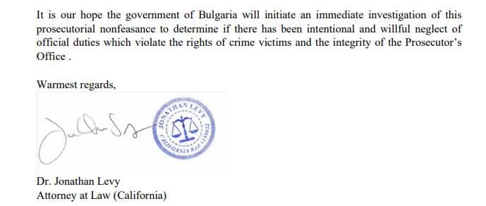 In einem Schreiben an das bulgarische Justizministerium vom 2. Juni fordert Levy eine sofortige Untersuchung der bulgarischen Regierung, weshalb der Generalstaatsanwalt untätig bleibe. Die Regierung möge herausfinden, ob es sich um eine absichtliche Vernachlässigung seiner Amtspflichten handelt, die die Rechte der Opfer verletzen würde.