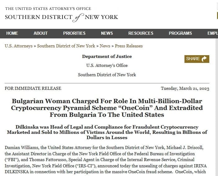 Die Chefin der „Abteilung für rechtliche Fragen und Compliance“ bei OneCoin werde im Zusammenhang mit dem OneCoin Betrugssystem des Betrugs und der Geldwäsche beschuldigt, heißt es in der Anklageschrift.