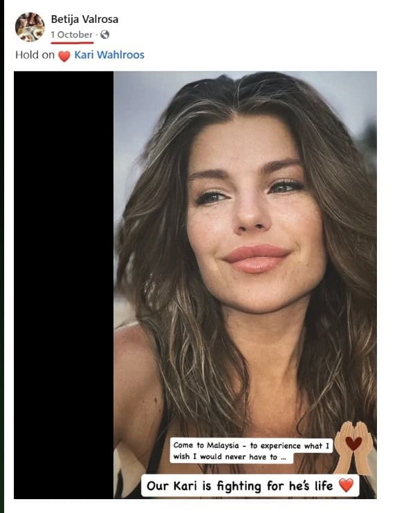 Dem allerdings widerspricht ein Post von Valrosa am 1. Oktober 2024 Da bittet sie mit Herzchen: „Halte durch Kari Wahlroos“. Und weiter unten: „Unser Kari kämpft um sein Leben.“
