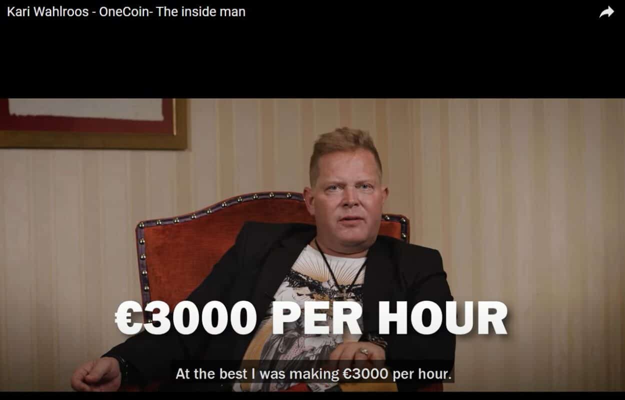 In einem Trailer für einen Dokumentarfilm , der im Januar veröffentlicht wurde, erzählte er, er habe ein „James-Bond-Leben“ gehabt. OneCoin sei eine „money making machine“ gewesen, „leider nur für sehr wenige Leute“ habe sie Geld gedruckt. Zu seinen besten Zeiten habe er 3000 Dollar in der Stunde verdient, so Wahlroos. Er schätze, insgesamt habe OneCoin 14 bis 15 Milliarden Dollar abkassiert.