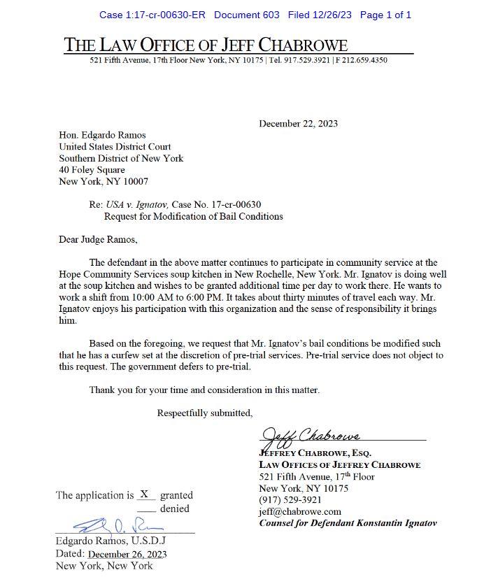 Laut Anwalt Jeffrey Chabrowe nimmt Konstantin an einem Gemeinschaftsprojekt einer gemeinnützigen Organisation in New Rochelle, ein paar Meilen nördlich der Bronx teil. „Mr. Ignatov ist doing well at the soup kitchen“, schreibt Chabrowe an Richter Edgardo Ramos und bittet ihn deshalb, Ignatov zu erlauben, dort länger arbeiten zu dürfen.