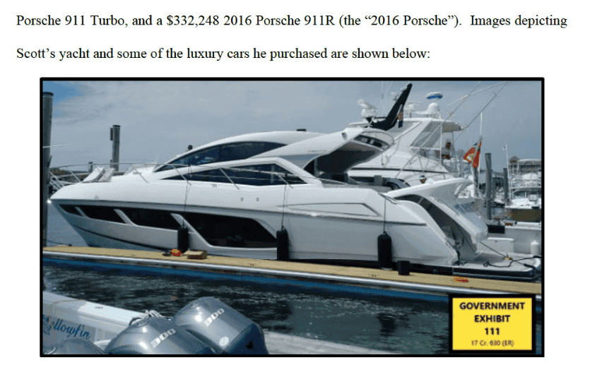 Mit dem Geld, das er von OneCoin erhalten habe, habe Scott einen verschwenderischen Lebensstil finanziert. Er habe mehrere teure Häuser in Florida und Cape Cod gekauft, eine „Sunseeker Yacht“ für 1,3 Millionen Dollar und mehrere Porsches, Luxusuhren, Schmuck und teure Handtaschen.